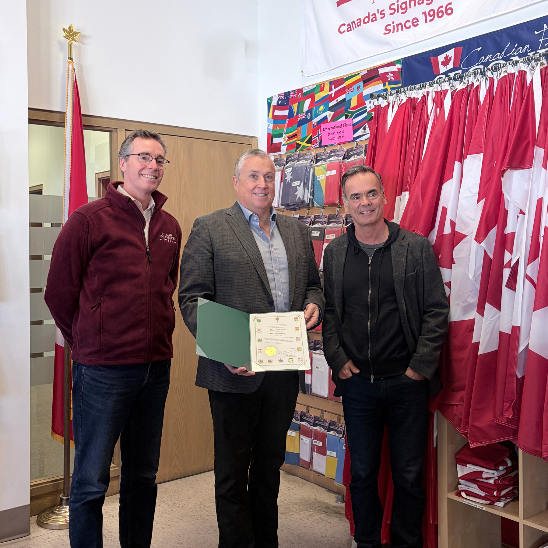 “It is an honour to celebrate this significant milestone with Flags Unlimited. Sixty years in business is a huge accomplishment. Our community is grateful to be home to a company that has demonstrated dedication to helping Canadians proudly display their pride and celebrating the history of our national flag.” MP of Barrie, Springwater, Oro-Medonte Doug Shipley